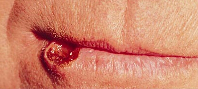 This is a picture of a sore appearing on the lip that has shown no signs of healing for two weeks and can be considered cancerous.